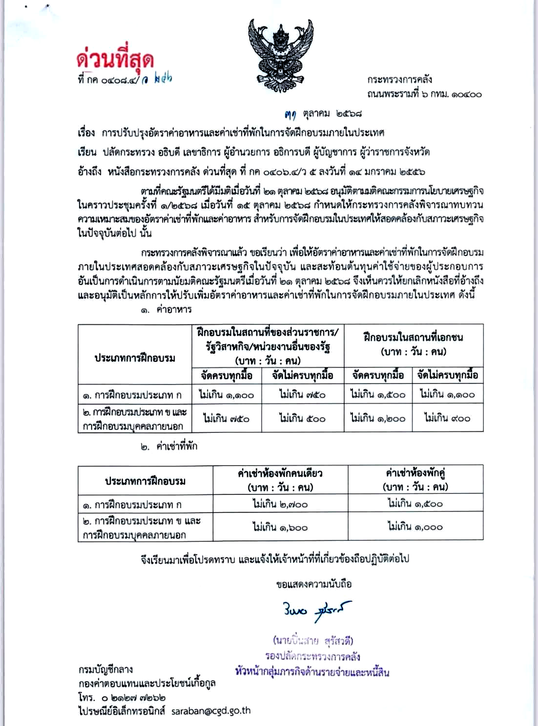 - การปรับปรุงอัตราค่าอาหารและค่าเช่าที่พักในการจัดฝึกอบรมภายในประเทศ ที่ กค 0408.4/ว 246 (31 ต.ค. 2568)